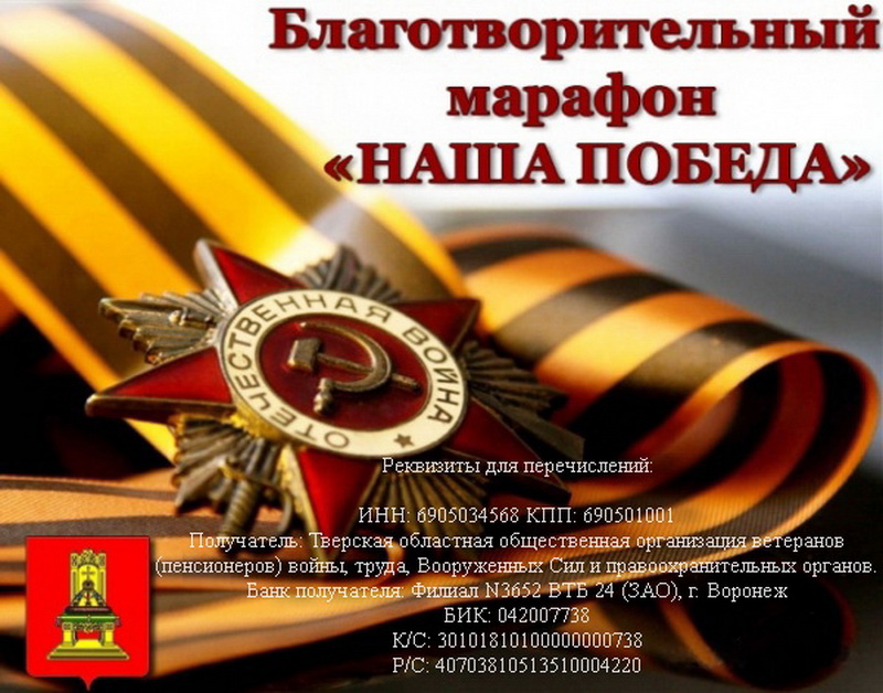 Жителей тверского региона приглашают внести свой вклад в реализацию проекта, который направлен на оказание адресной поддержки ветеранам Великой Отечественной войны. Сделать это можно в рамках благотворительного марафона «Наша Победа», который продолжается в Тверской области. Как сообщает пресс-служба правительства Тверской области, адресная материальная помощь оказывается участникам и инвалидам Великой Отечественной войны, вдовам военнослужащих, узникам фашистских концлагерей, жителям блокадного Ленинграда, труженикам тыла.