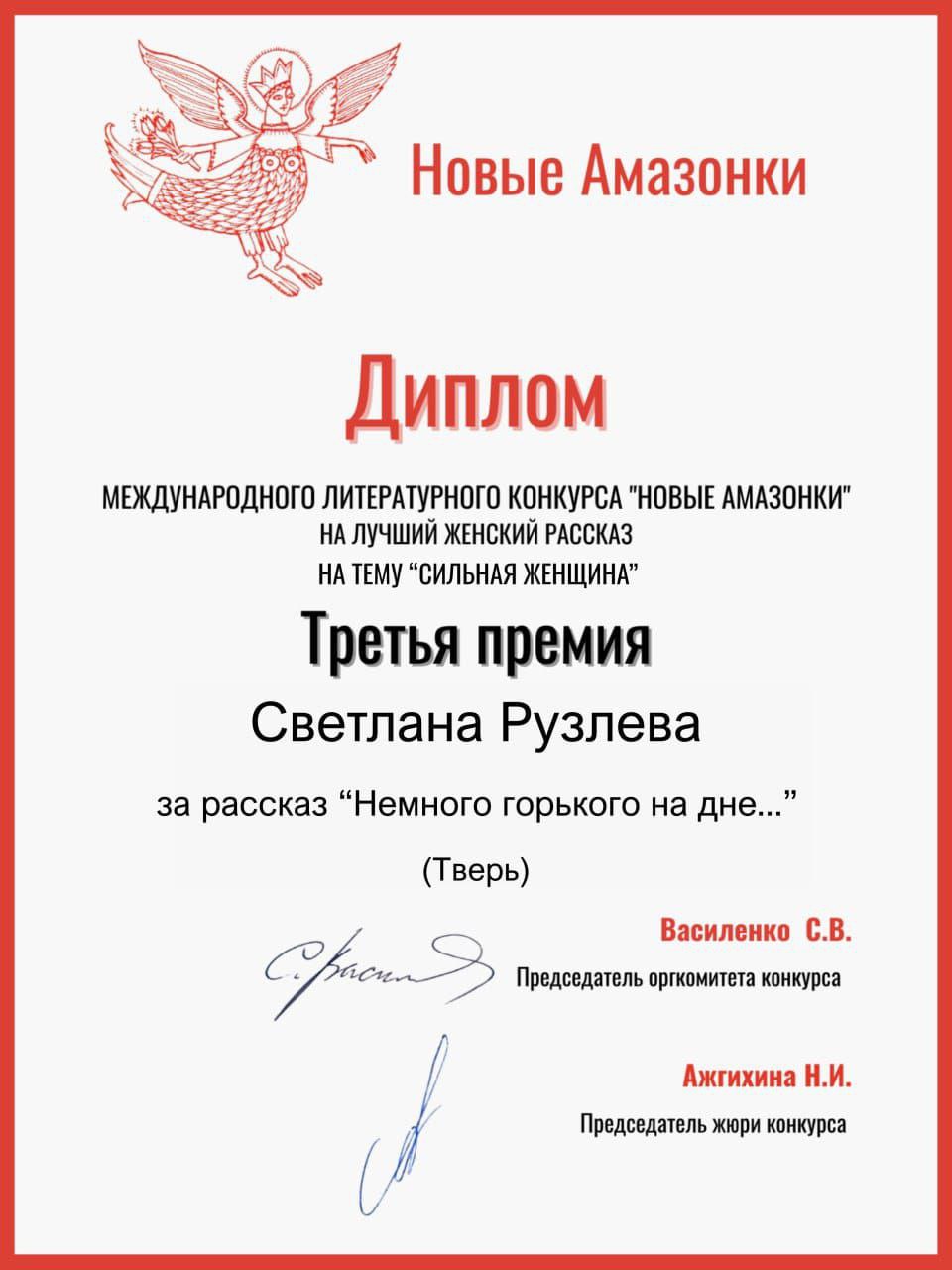 В Москве завершился международный конкурс Союза российских писателей. Его тема – «Сильная женщина» стала интересной участницам из России, стран ближнего и дальнего зарубжья. В лонг-листе, который опубликован на сайте союза https://www.writers.ru/, названия более сорока работ. В результате были определены победители, которые традиционно получили на Рождество дипломы. Среди лауреатов – главный редактор ТРИА «Социум» Светлана Рузлева, которая заняла третье место с рассказом «Немного горького на дне». Рассказ был посвящен современным журналисткам, которых по любым критериям можно назвать сильными женщинами, сохраняющими и развивающими профессию. Светлана не успела на традиционную церемонию и диплом ей будет вручен 14 января в Москве, в Центральном доме литераторов.