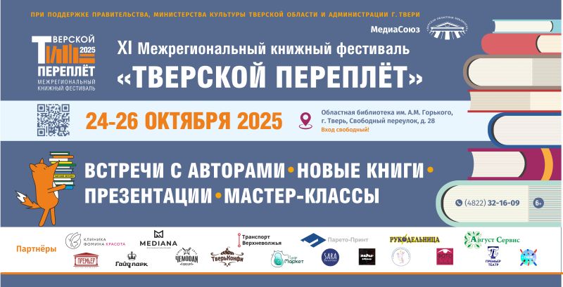 Напомним, ХI Межрегиональный книжный фестиваль «Тверской переплет» состоится 24-26 октября в Областной библиотеке им. А.М. Горького. Следите за анонсами событий.