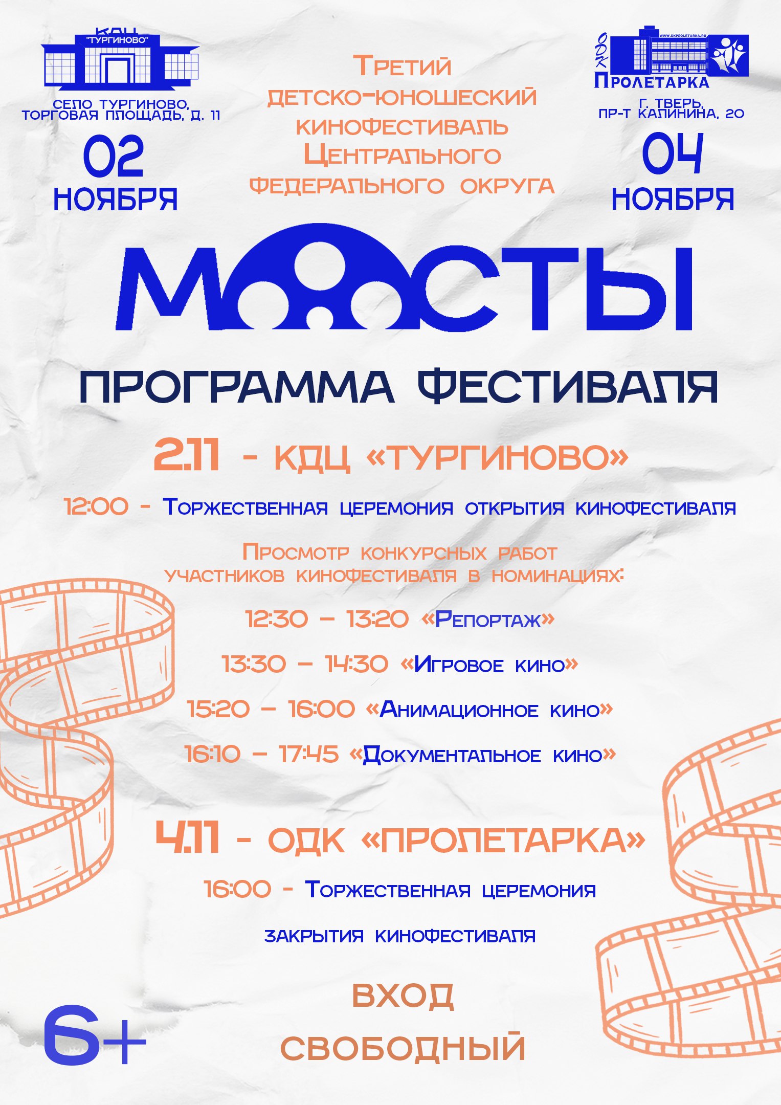 По сложившейся традиции, для торжественной церемонии встречи 2 ноября в 12.00 и приветствия участников, гостей и зрителей  III-го детского кинофестиваля Центрального федерального округа «Мосты»,  вновь откроет свои  двери   Культурно - досуговый  центр  «Тургиново». Именно здесь, на главной площадке  фестиваля, «Мосты» соединят команды - участницы  детского кинотворчества ЦФО  из общеобразовательных школ, лицеев, гимназий, колледжей, творческих кружков, театральных студий, киношкол,  профильных детских киностудий и телекомпаний в возрасте от 7 до 17 лет, которые успешно прошли первый заочный отборочный тур  творческого соревнования. Их  конкурсные короткометражные работы  в 12-ти номинациях: лучшее анимационное, документальное и  игровое кино; лучший репортаж; лучший репортер/журналист; лучшая индивидуальная  актерская работа; лучшая  ансамблевая  актерская работа; лучшая сценарная, режиссерская и операторская работы; лучшая патриотическая работа; а также лучшая работа, посвященная  80-летию Победы в Великой Отечественной войне  2 ноября, с 12.30 до 17.45 будут представлены всем желающим к просмотру в основной части программы в концертном  зале КДЦ «Тургиново». Лучшая из работ  получит  Главный приз  -  Гран - при фестиваля!